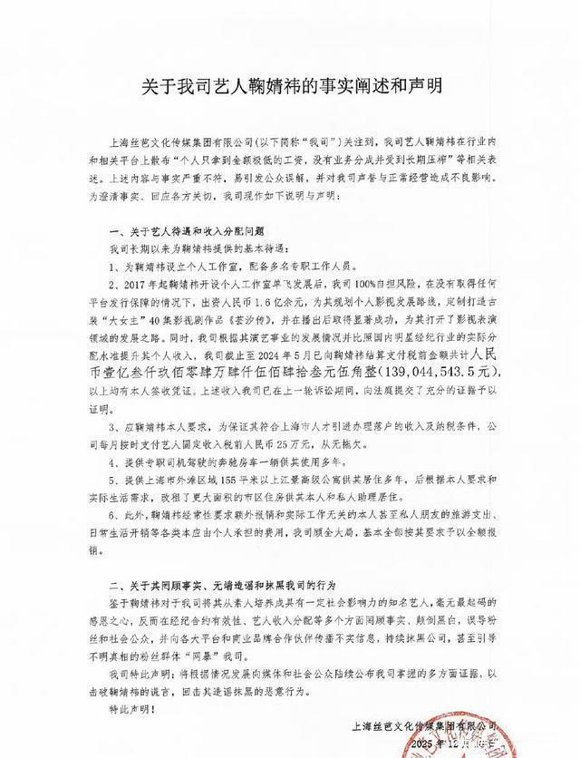 鞠婧祎和老东家丝芭传媒彻底闹翻,1.39亿收入明细被直接甩出来,双方各执一词闹得不可开交。 事情是这样的: 丝芭传媒先是爆料鞠婧祎对外声称“工资少”是假的,还晒出十年间给她的税前总付款1.39亿。 外加一堆福利:外滩155平江景房(后来还换了更大的)、每月25万固定工资、奔驰专属司机、独立工作室和团队,连旅游、生活开销甚至部分朋友支出都能报销,为了帮她落户上海更是一路兜底,还砸1.6亿给她定制《芸汐传》。