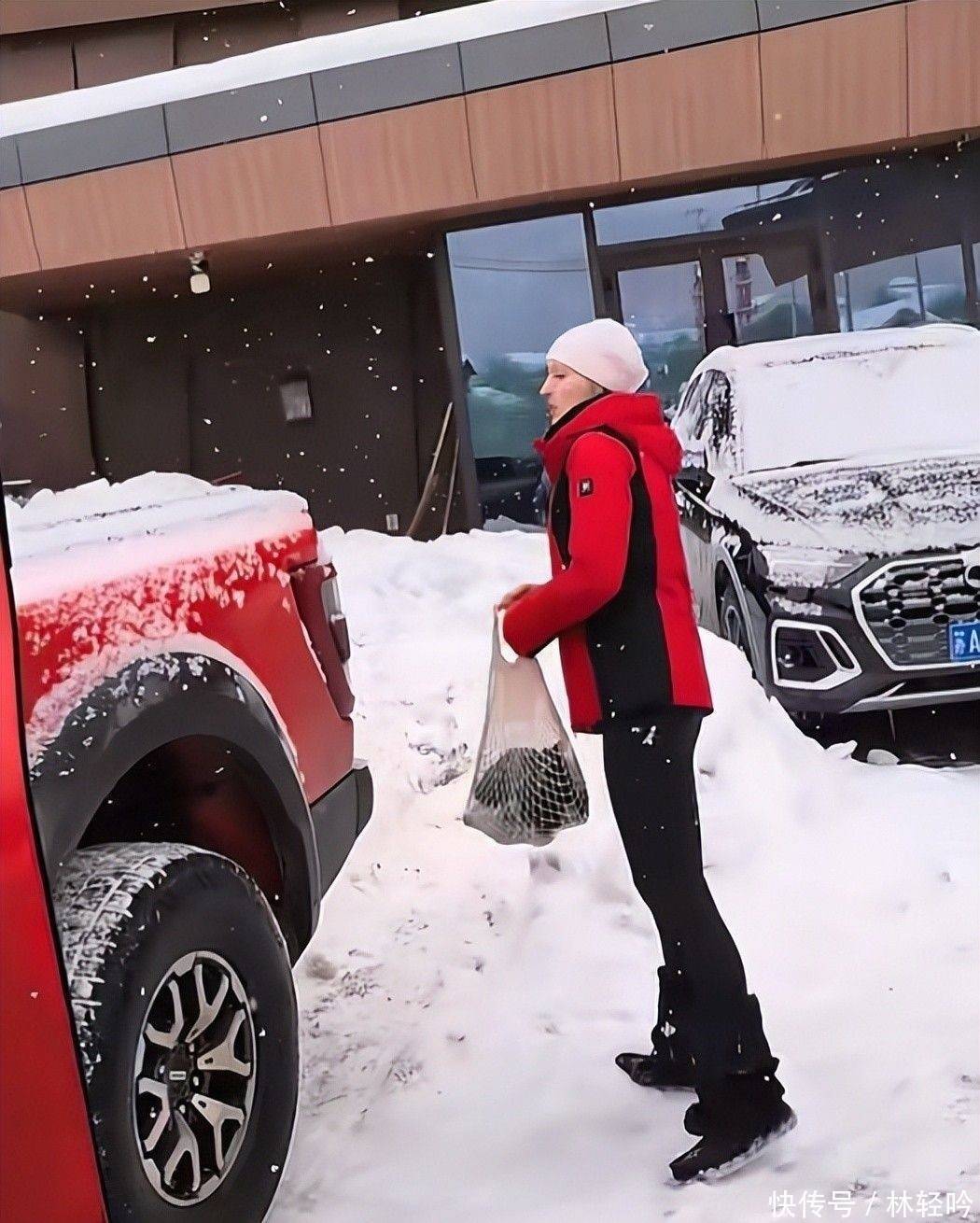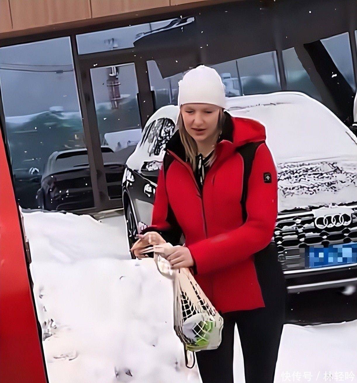素颜状态下,她肌肤透亮,鼻梁高挺,下颌线清晰利落,典型的立体欧式轮廓,即便眉梢覆雪、睫毛凝霜,仍掩不住由内而外的明艳气质。